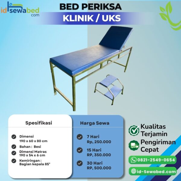 Bed periksa ini dirancang dengan konstruksi yang kokoh dan stabil, dilengkapi tangga untuk memudahkan pasien naik dan turun, memiliki permukaan yang nyaman serta mudah dibersihkan, sehingga sangat ideal digunakan untuk UKS, klinik, puskesmas, maupun fasilitas kesehatan lainnya.