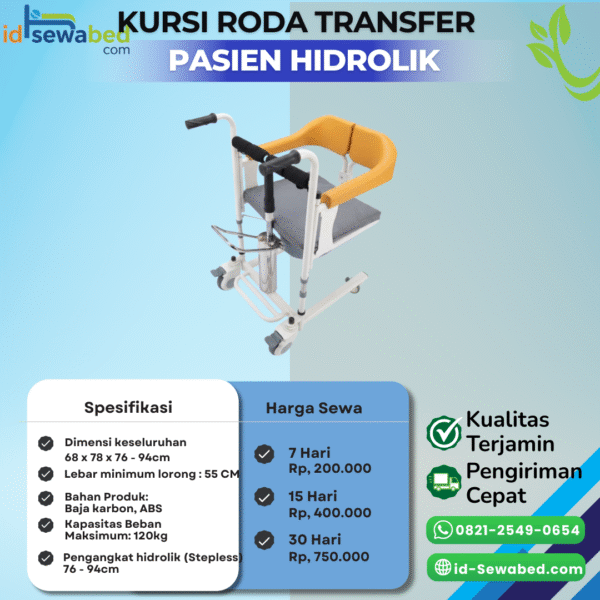 Kursi Roda Transfer Pasien Hidrolik adalah alat bantu mobilisasi yang dirancang untuk memindahkan pasien dengan aman dan nyaman, baik di rumah maupun fasilitas kesehatan. Dilengkapi sistem pengangkat hidrolik (stepless) dengan pengaturan tinggi 76–94 cm, kursi ini memudahkan proses transfer dari tempat tidur ke kursi roda, sofa, atau toilet.