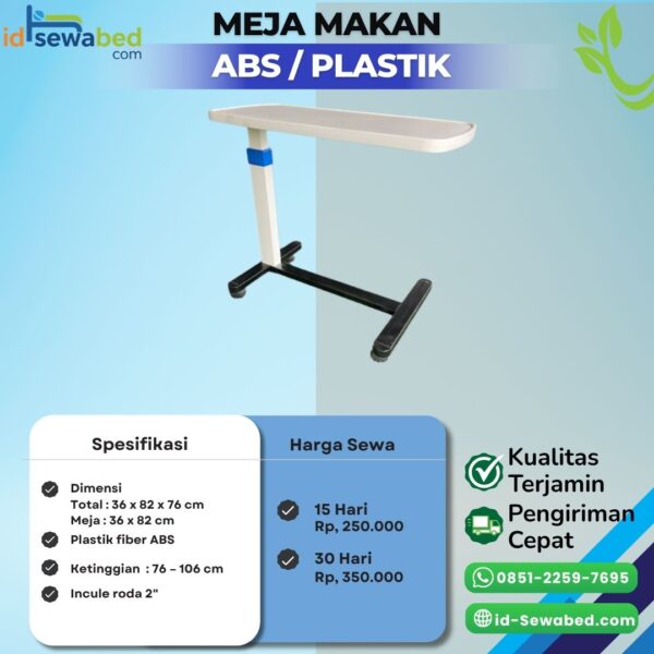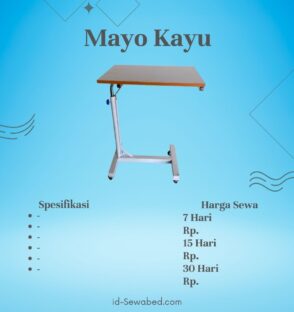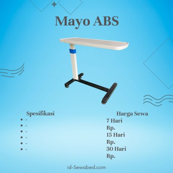 Mayo ABS adalah meja instrumen medis yang terbuat dari bahan ABS plastik berkualitas dengan rangka kokoh. Umumnya digunakan untuk meletakkan peralatan medis atau perlengkapan perawatan pasien. Meja ini dilengkapi roda sehingga mudah dipindahkan, serta desainnya sederhana, ringan, dan mudah dibersihkan sehingga sangat praktis digunakan di rumah sakit maupun perawatan pasien di rumah.