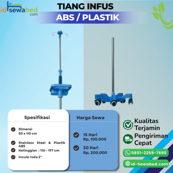 Tiang infus ABS adalah tiang infus ringan namun kokoh yang dirancang untuk kebutuhan rumah sakit, klinik, puskesmas, dan perawatan pasien di rumah. Menggunakan bahan ABS berkualitas, tahan karat, serta mudah dibersihkan, tiang infus ini memberikan kestabilan dan keamanan saat penggunaan. Dilengkapi pengatur ketinggian yang fleksibel serta roda yang mudah digerakkan, tiang infus ABS sangat praktis, awet, dan nyaman digunakan untuk berbagai kebutuhan medis.